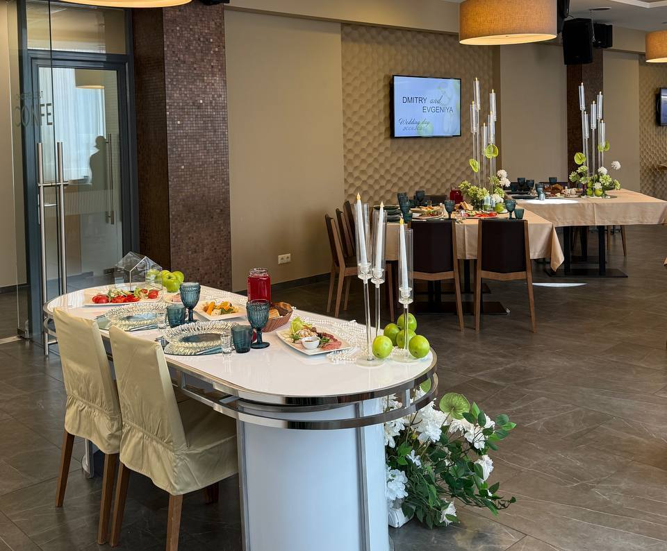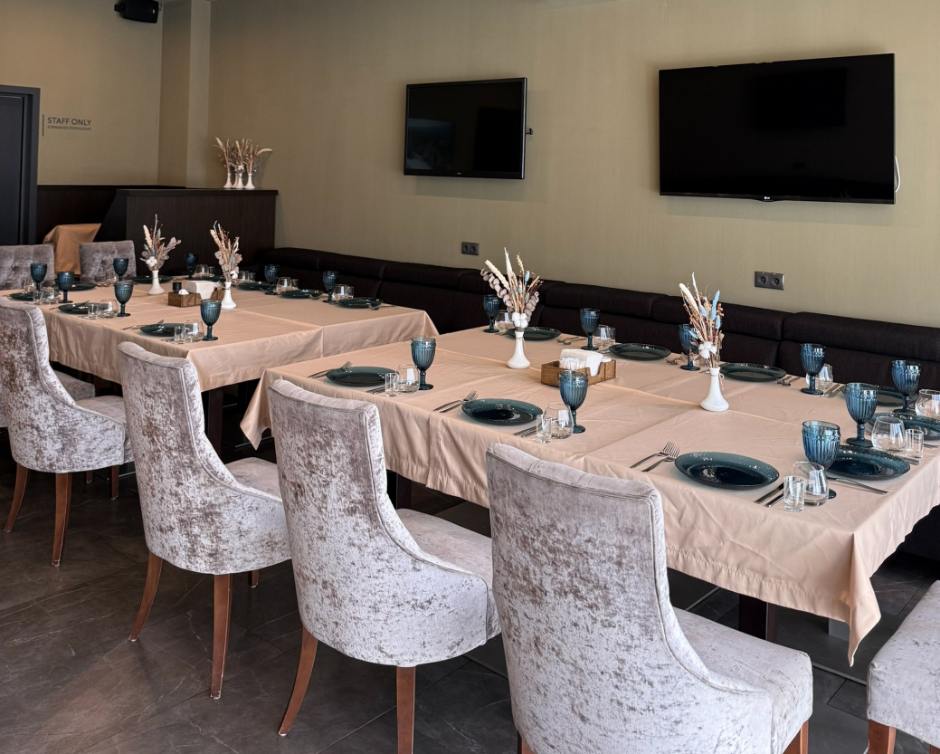 В зале: телевизор, кондиционер, акустическая система, светомузыка, флипчарт (при необходимости)